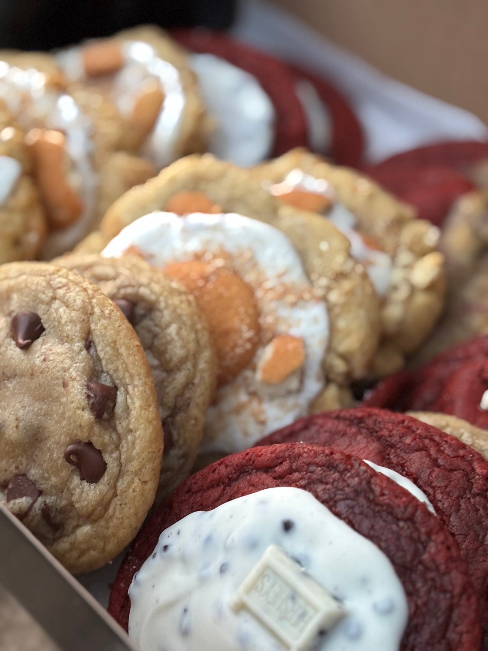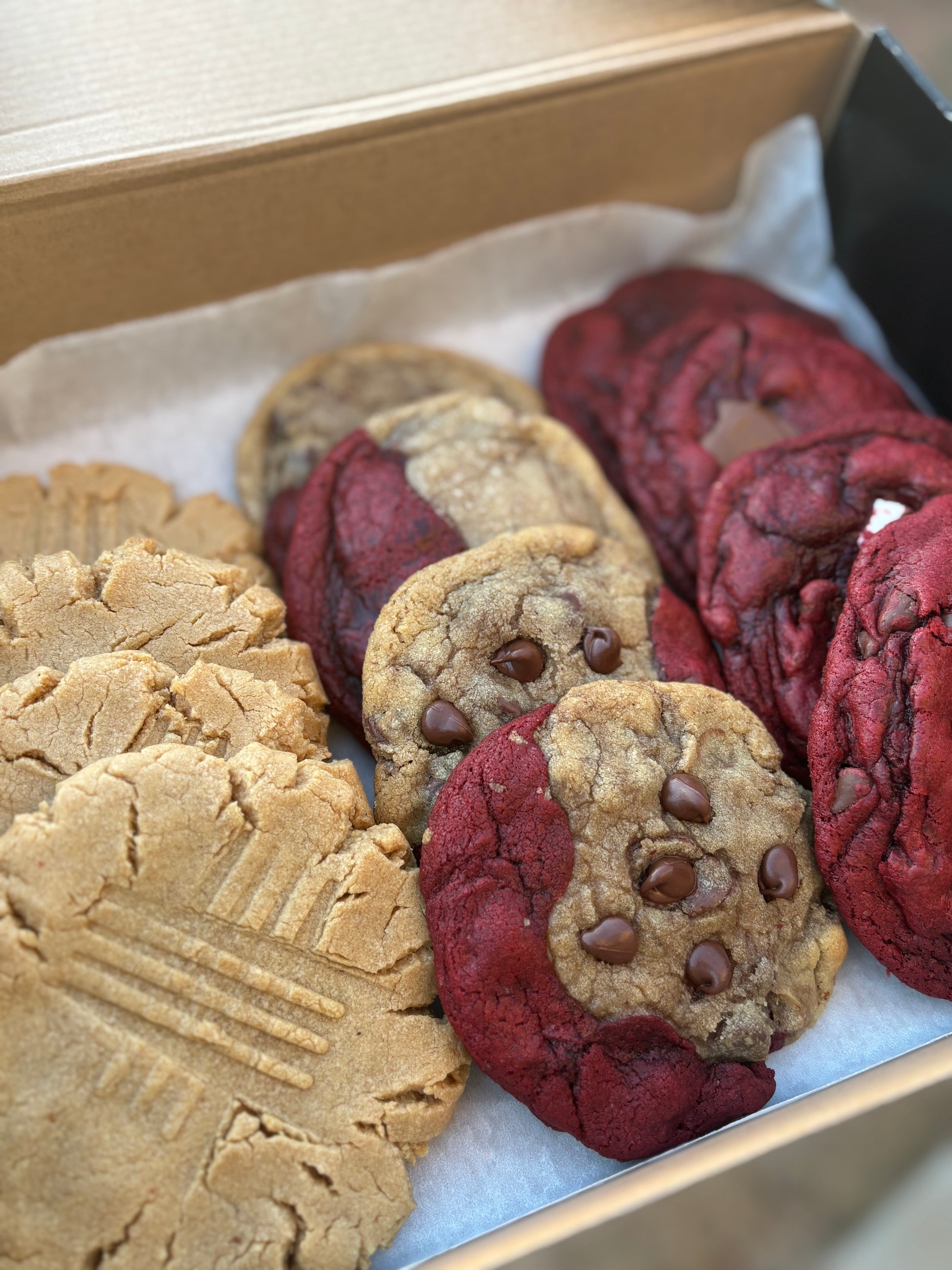 Variety box Indulge in a delicious variety of gourmet cookies with our dozen variety box. Satisfy your sweet tooth with mouth-watering flavors such as strawberry krumble, lemon supreme, strawberry/lemon,Brown butter Chocolate chip, cookies and cream or peanut butter. With a mix of fruity and chocolatey options, there's something for everyone in this box. Order now and treat yourself to a taste sensation. Choose up to 4 different flavors.